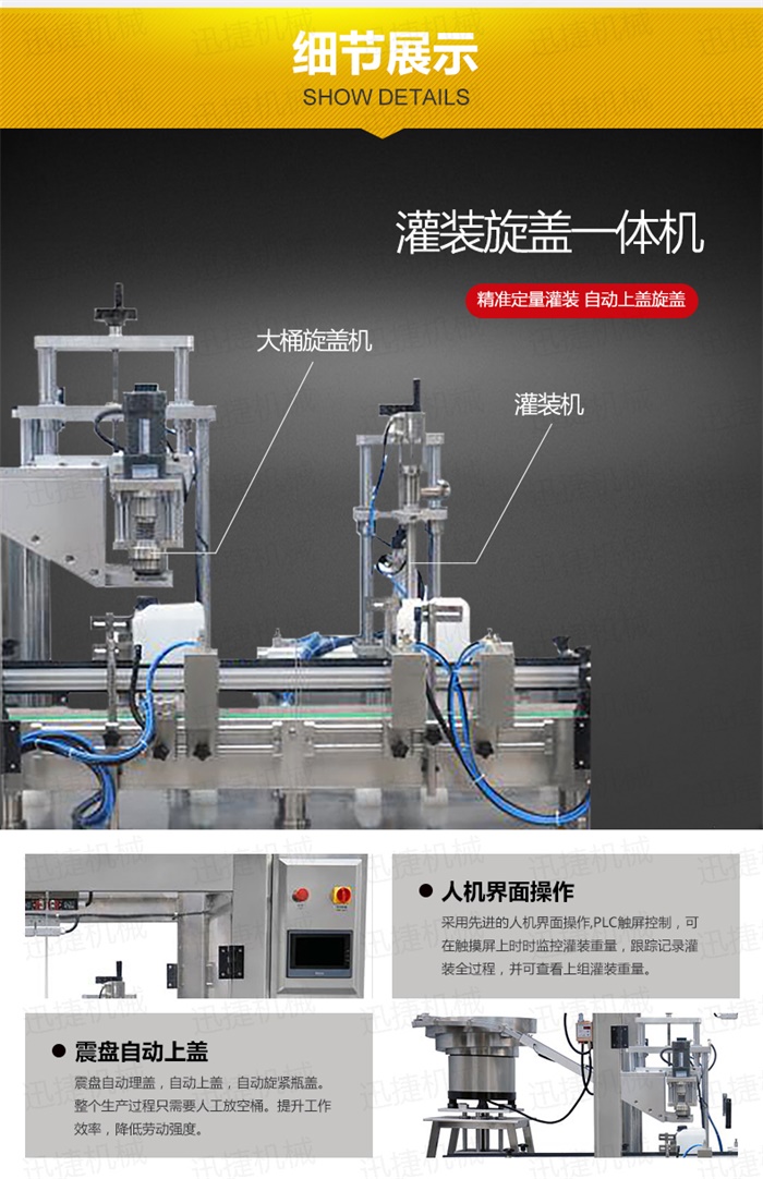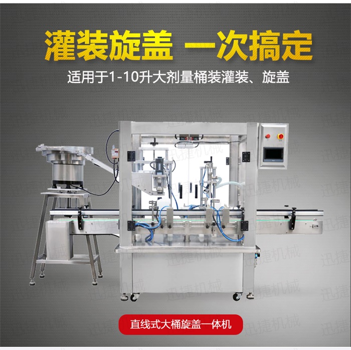 特點(diǎn):定量灌裝,和瓶蓋旋蓋,在一臺(tái)機(jī)器上完成。具有占地空間小,自動(dòng)化程度高特點(diǎn)工作流程:液體灌裝頭自動(dòng)定位定量灌裝,機(jī)器灌裝完成1-10升的灌裝,隨即進(jìn)入下一個(gè)工位,震盤自動(dòng)理蓋,自動(dòng)上蓋,自動(dòng)旋緊瓶蓋。整個(gè)生產(chǎn)過(guò)程只需要人工放空桶。提升工作效率,降低勞動(dòng)強(qiáng)度。