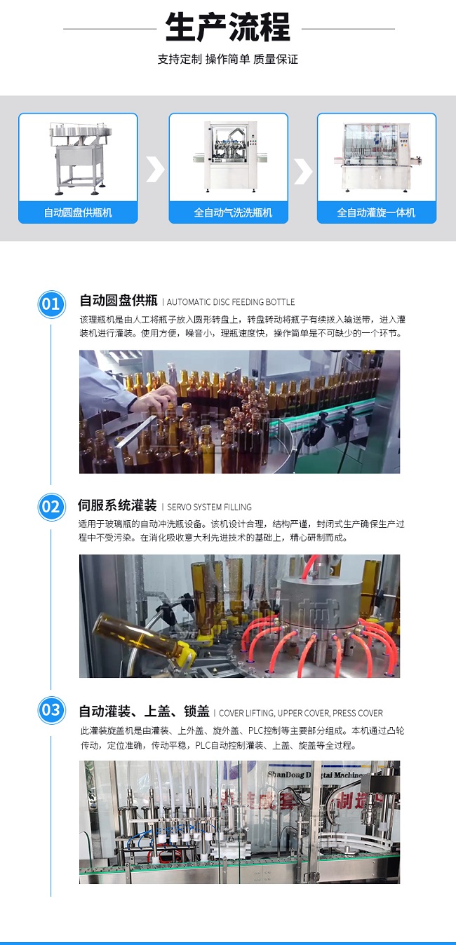 本灌裝流水線設備具有穩定可靠、自動化水平高,相比同類產品有著更長的使用年限,維護簡單,整線中各設備的協調性、連貫性強,整線設計合理等特點。灌裝設備采用系統結構,為當今行業內水平,整線滿足量產化、集成化生產的需要。