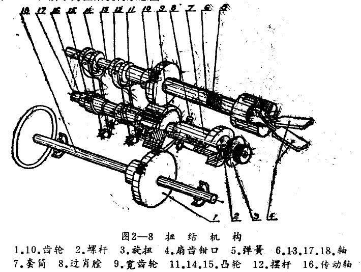 搪塊經(jīng)裹包后,兩端要扭結(jié)封閉。該機構(gòu)由左右兩部分組成,圖示為左端部分。